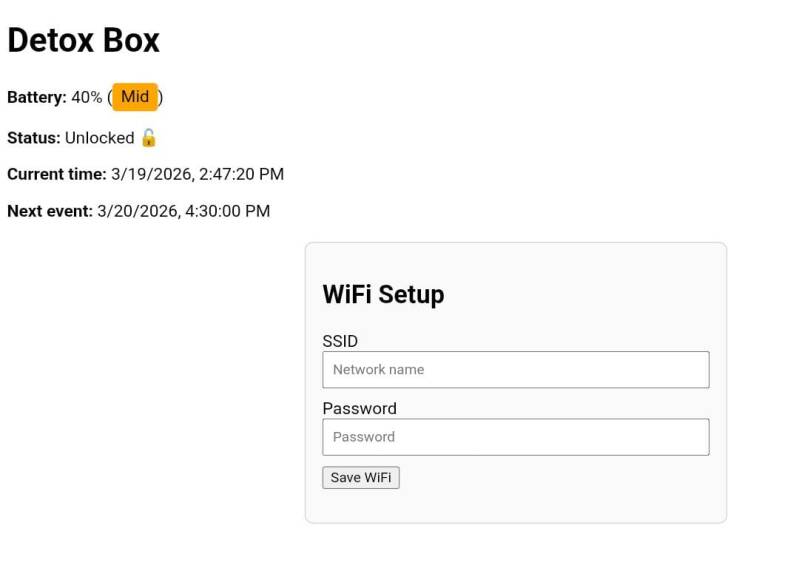 Het instellen van je Detox-Box is eenvoudig. Verbind je toestel met de ingebouwde WiFi van de Detox-Box. Verbind de box daarna via de webpagina met je thuis WiFi-netwerk en begin met het plannen van je 'detox'-momenten. De box is volledig oplaadbaar via USB-C, zodat je altijd klaar bent voor je volgende focus-sessie.